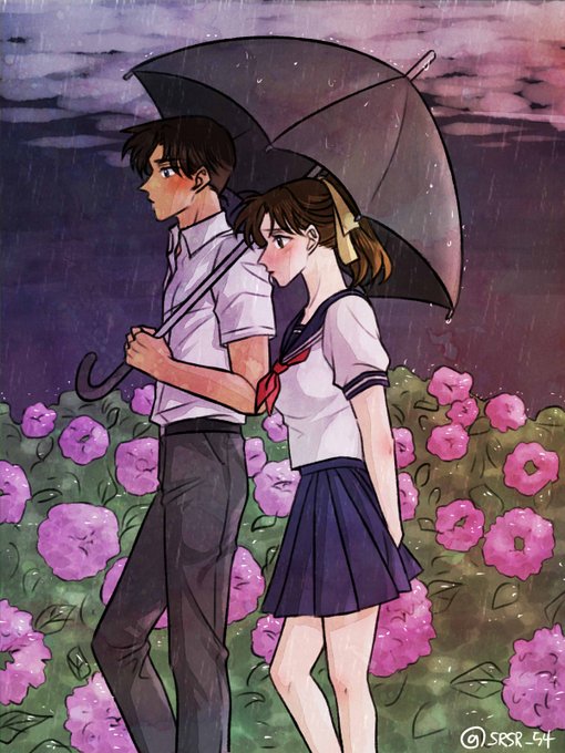 #コナンまじ快深夜の真剣制作60分一本勝負 お題: 紫陽花 キャラ: 服部平次、遠山和葉 形式: イラスト 「雨と紫陽花」