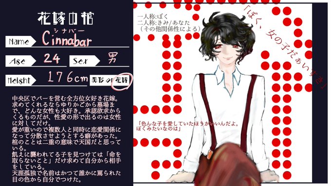 こちらの企画様に参加させていただきます【@hanahitugi_TL】 ぎりぎり一人目お邪魔します。 全方位女好きの花嫁です。 番は成立予定の方いますが他なにも決まってないのでゆるゆる遊んでくださると嬉しいです。 #花棺_CS #花棺_中央区 #花棺_花嫁 #花棺_番成立済