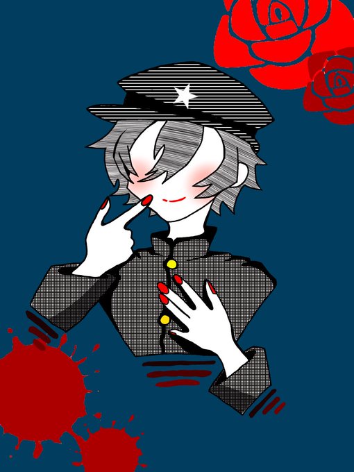 #キャラ被りデザインゲーム 時間ギリで描ききったぜ(((( ’ω’ )))) 三白眼になってるようななってないようなだぜ お題→剣、マント、メッシュ、短髪、赤色、三白眼、黒髪、ピアスorイヤリング