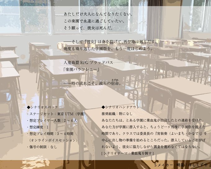 学園に潜入し、学園祭の準備を進めながら調査をするブラッドパスのシナリオになります。学園へ潜入! 学園祭! ループもの! この言葉にぐっと来る方におすすめです。Boothにて無料DL頒布開始しました。