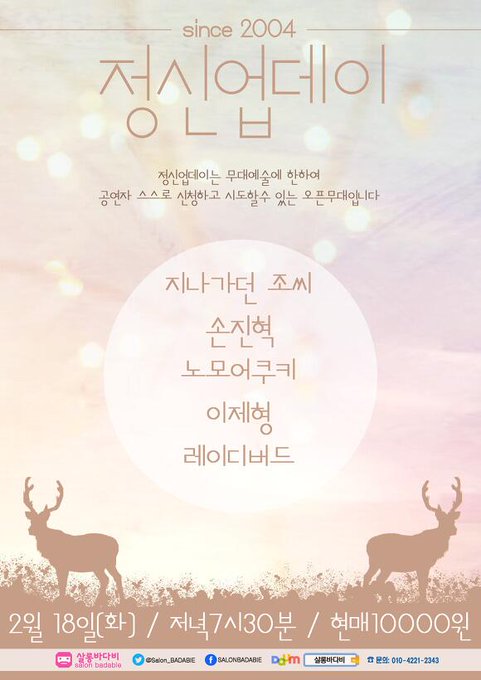 [2월 18일 화요일 '정신UP데이'] - 지나가던조씨ㅣ손진혁ㅣ노모어쿠키ㅣ이제형ㅣ레이디버드 - 7시30분, 현매1만원 ※정신UP데이는 무대예술에 한하여 공연자 스스로 신청하고 시도할수있는 오픈무대(쟝르불문)※