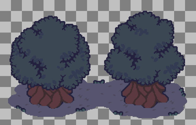 Two new takes on pixel art trees, pretty high resolution, the left one is more top-downish. #gamedev #pixelart #aseprite #tree