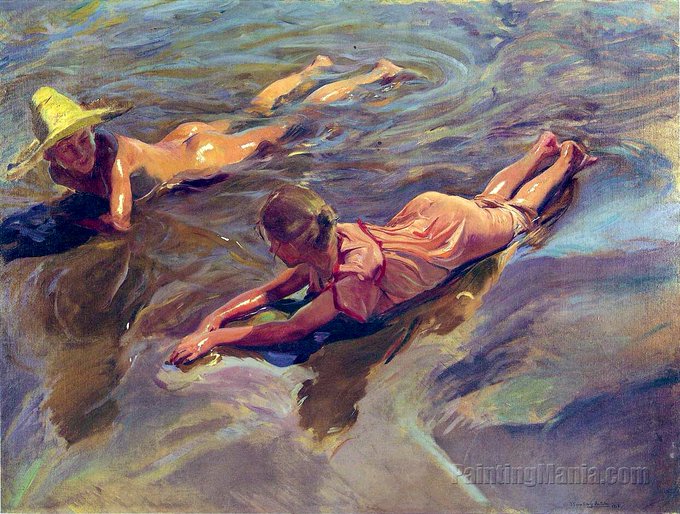 En “Idilio en el Mar” pintado por Joaquín Sorolla, la obra muestra una pareja de niños jugando en la playa de Valencia, 1908