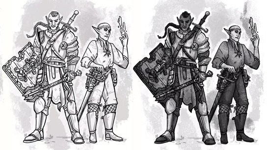 🗡️✨Time to share a new dnd commission! Introducing Gawyn! Who is a Human, Paladin of Torm, Who is often very serious, and a bit of a grump. And Sheesha! Who is a Half-Elven Arcane trickster rogue and Wildmagic Sorcerer with a flair for chaos! (A girl after my own heart)