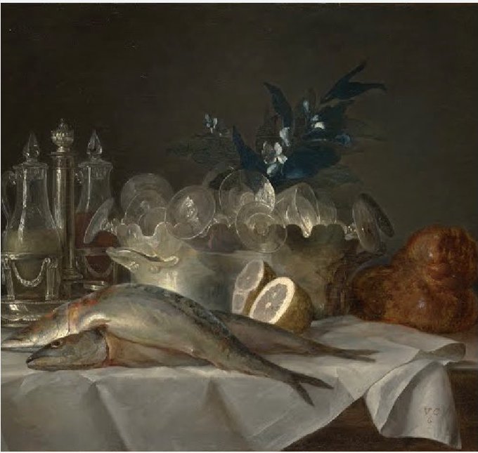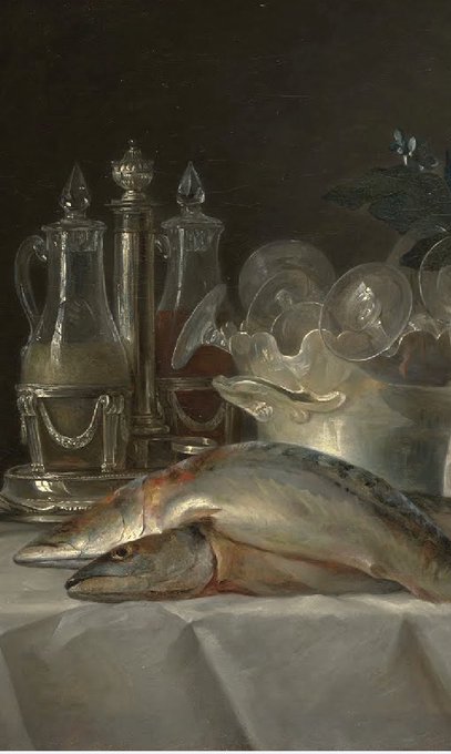 Still-life with Mackerel. Anne Vallyer-Coster. #womenartists #stilllifepainting #silverylight