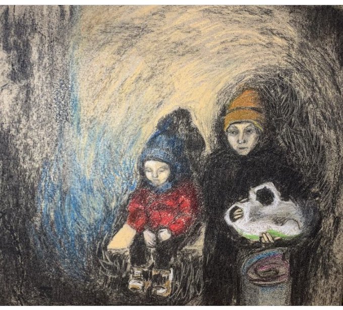 Day 4 of war. Drawing by Jasia Holberg an artist in Ukraine I follow on Instagram. Hadn’t seen any posts for a few days but pleased to hear just now she and her small son are in relative safety.