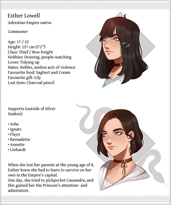 Esther, an orphan born in the Empire's capital. She raised her brothers and sisters alone by learning how to steal and survive on her own. She met Cassandra after one fortunate incident in the capital, the two are always together
