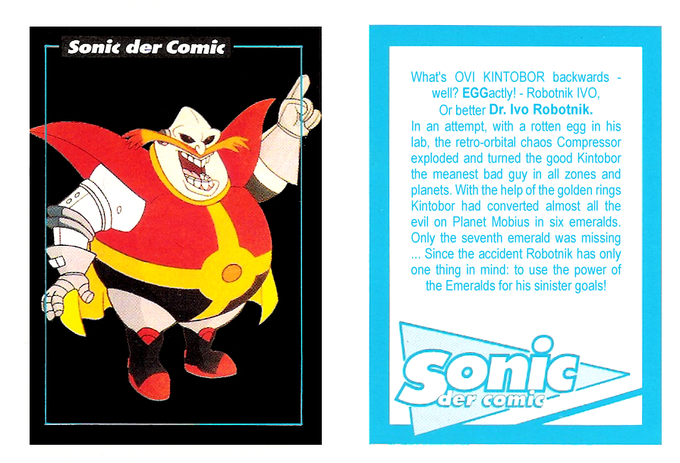 The German release offered their own "Sonic Der Comic" cards. Notably, the one on Robotnik mistakenly uses his SatAM design, despite obviously describing the StC Robotnik.
