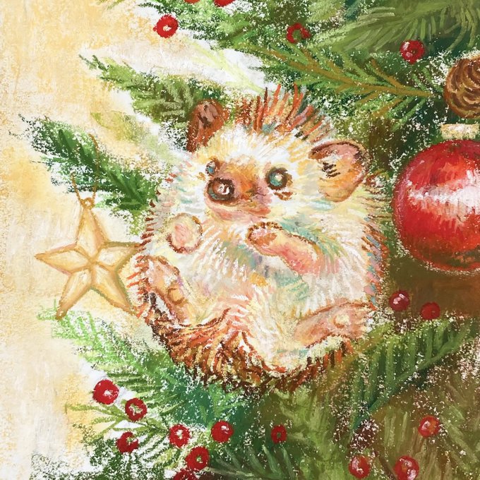 #ハリネズミ #ヨツユビハリネズミ #クリスマス #絵柄が好みって人がいたらいいなぁ #オイルパステル