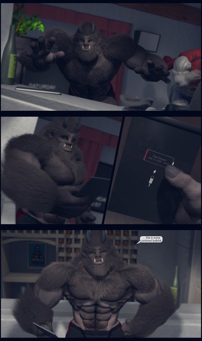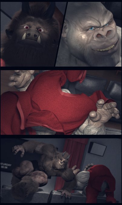 Because #APEril, here's a little comic of a huge hulking #gorilla off-duty #supervillain trying to #wrestle, #bearhug, #crush and #dominate a superhero beastman.