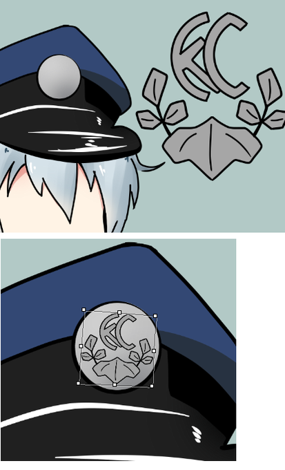 ⑩帽子のエンブレムは予め素材として正面図を作っておいて、変形して貼り付ける。特にこだわりがなければ正面図で描いて変形(メッシュ)貼り付けが時短になる