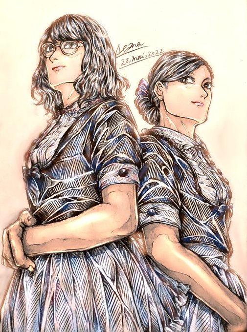 差分とアナログ元絵です 効果レイヤーだけ残したら色味の関係で左右2人の服の色がお互いの色みたいになってて楽しい