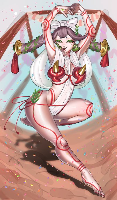 #仙太郎絵巻 アメノウズメ 岩戸へ隠れてしまった天照を外へ引きずり出す為に岩戸の前で踊った女神。不思議な踊りで神々の笑いを誘い場を大いに盛り上げた最古の踊り子。だがナマコが嫌い。