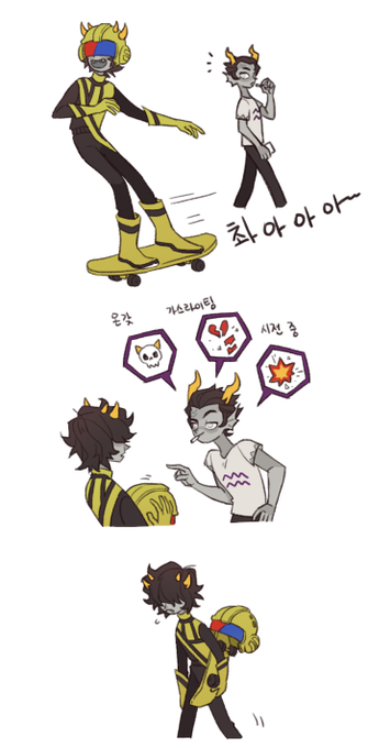 쿠프럼과 폴리클 배드 엔딩 처음엔 충격적이었는데 곱씹을수록.. 음.. 좋다? ㅋㅋ ㅋ ㅋㅋ 그리고 폴리클 뿔 모양 보고 거미 다리 같다고 하는 묘사도 좋아 #hiveswap #homestuck