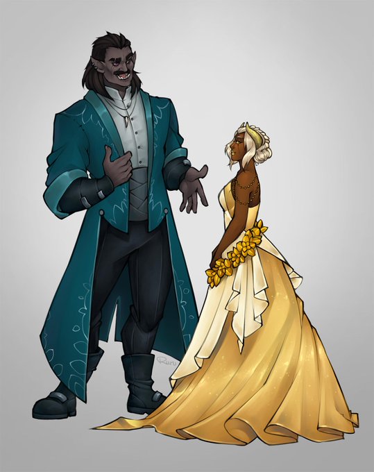 My two fav npcs, Bronwyn (half orc ray of sunshine) and Christo (human-appearing, tho secretly a demon, grumpy boy) smooching. I love them SO MUCH and this makes my heart so happy <3 <3 <3 art by the super stellar amazing @oddthesungod