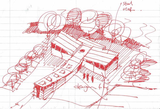 School sketch by Shape Architecture a dragonfly at the ricers edge in Kent #drawing #schooldesign #greenschools #sedumroof #dragonfly