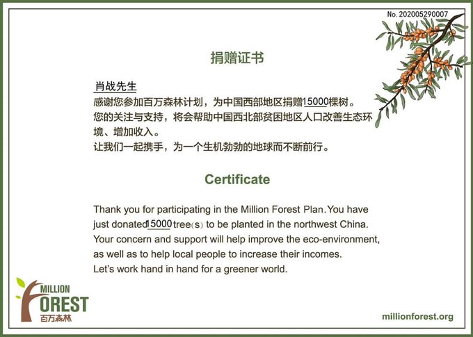[แปล] ขอขอบคุณ 酷我音乐 (Million Forest) ที่ได้บริจาคต้นไม้ 15,000 ต้นให้กับพื้นที่ที่ยากจนทางภูมิอากาศทางตะวันตกเฉียงเหนือของประเทศ ผ่านโครงการ Million Forest ซึ่งต้นไม้ทั้งหมดจะมาถึงในฤดูใบไม้ร่วง... (มีต่อ👇🏻)