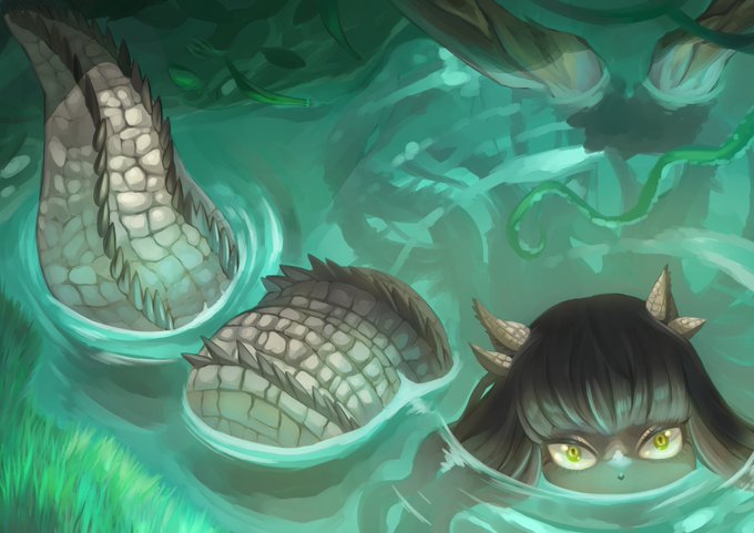 [密林の狩人] 凶暴なワニ系女子 皮描くの面倒でしたがいい感じに塗れてうれし😊 #秋の創作クラスタフォロー祭り #絵描きさんと繋がりたい