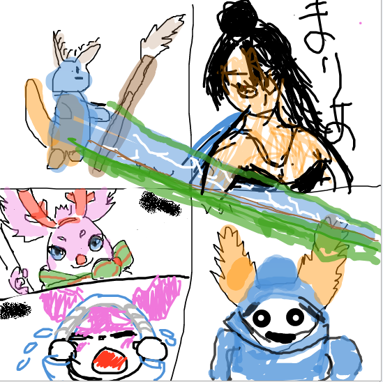 ギルメンとピクトセンスをしました。 分割でレピィを描きました。左下の2人がめちゃうまいのに対して、なぜか1人がマリアを描き始めて、口から水を噴出して、流しそうめん大会が行われた図です。