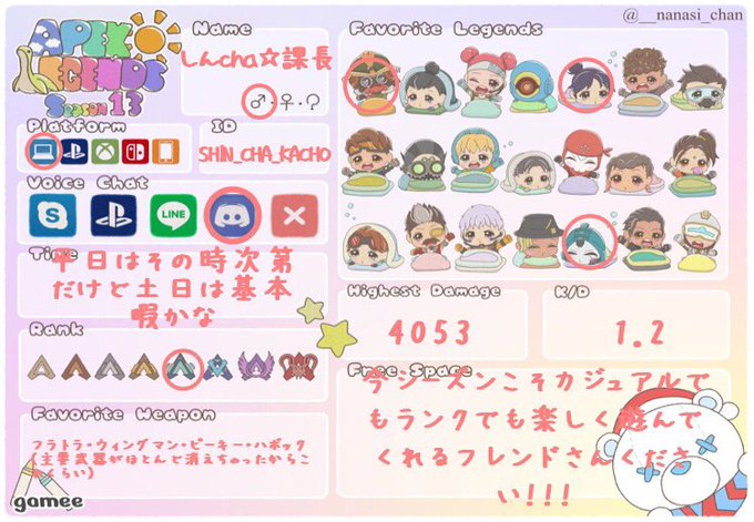 シーズン変わって遊んでくれる人ほしいのでAPEXの自己紹介カード更新した!!けど間違えてたから修正した!!!www