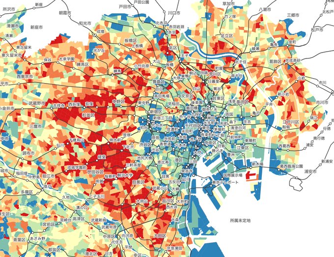 町丁目では少し粗かったので「町丁目×用途地域」ごとに集計したら、幹線道路沿いの延焼遮断帯が浮かび上がってきた。