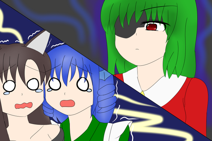 「マインドシェイカーを使う!」偽物の月を背景に。 幻想少女大戦永のモーション風に描いてみた。 #深夜の真剣お絵描き60分一本勝負