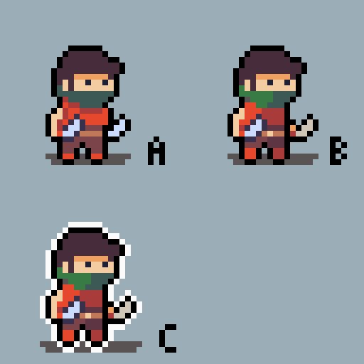 Made some experiments with shading and white outlines this morning to see if I could improve my character sprites with low effort. A is the old one and B and C have a bit of simple shading. Which one do you prefer? #pixelart #gamedev #indiedev #IndieGameDev #indiegame