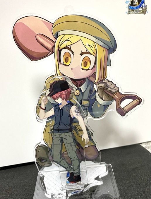 バニヤンちゃんアクキーで遊ぶ図 いつもの立ち絵アクキーと並べるとサイズ感がかわいいし(1枚目)なんか未知のものに触れようとしてるみたいなポーズに見えてきてカービィを添えた(2枚目)