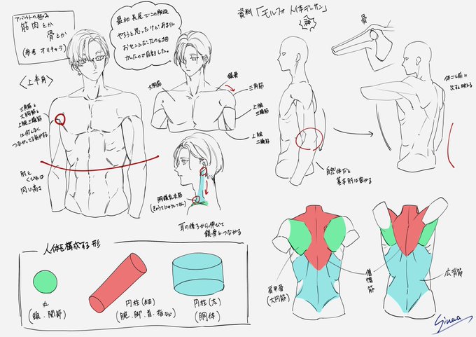アンケートで票数多かった「体の描き方(上半身のみ)」と「髪の描き方」をまとめて見ました! 正直フィーリング脳筋で描いてるので解剖学的にも間違ってる点あるかと思います。