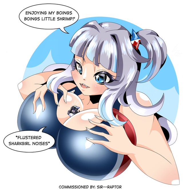 Drawn by @ZantyBunny and starring Alluria and #GURA with Gura having some pronounced boings boings and enjoying having Alluria between them... much to Alluria's dismay.