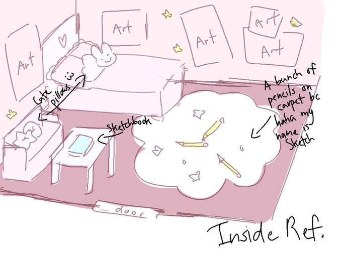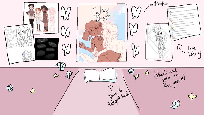 Concepts for my booth while we’re at it 🙏🙏 (there was supposed to be a magical sketchbook teleporter and the attic was supposed to be bigger and cooler but we couldn’t do it bc of limitations 💔)