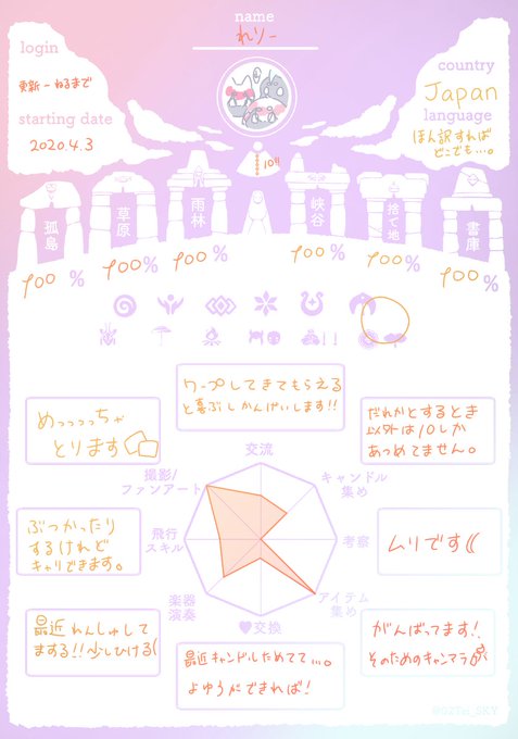 #sky星を紡ぐ子どもたち #sky自己紹介カード そろそろ更新しないとと思ったので更新~!!! 手書きで汚くてすみませぬ…。 ♡RTどちらもお迎え致しまする! 最近ちゃんとしたの描いてなかったから全然描いてなかった…、ちょと昔のも混ぜつつ絵も載せときます!