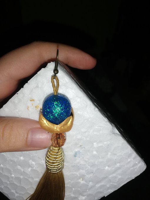 Hace semanas hice el pendiente de Xingqiu con materiales que tenía yo y algunas cosas que tuve que comprar. La bolita azul era opaca, y yo le di mi magia, el engarce dorado lo hizo @DragonMikleo y con ello el resultado final.