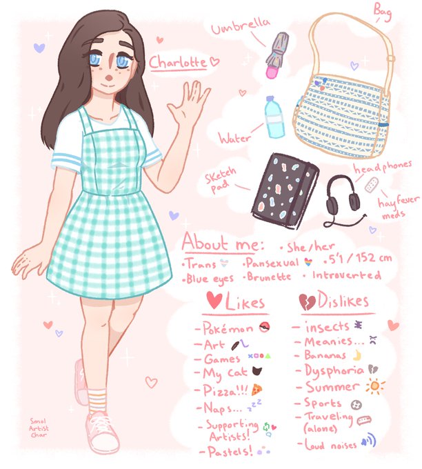 Here's mine: I'm Charlotte, a trans woman artist who loves drawing pokemon and cute girls in pastel soft aesthetics!