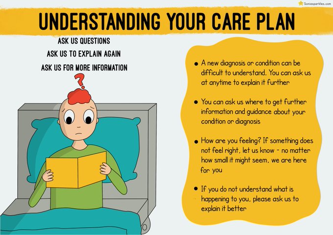 18/23 Understanding your care plan. I cannot emphasise enough how much we need to explain things. This helps them to know what to look out for, when somethings not right and if they need to speak up. They are our alert system, we need to use it more by educating patients