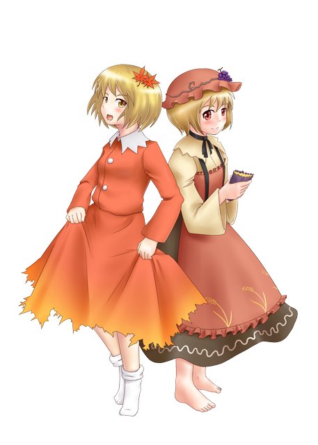 Minoriko Aki, the goddess of harvests and her sister Shizuha Aki, the goddess of changing leaves. Together, they control and regulate Autumn in Gensokyo.