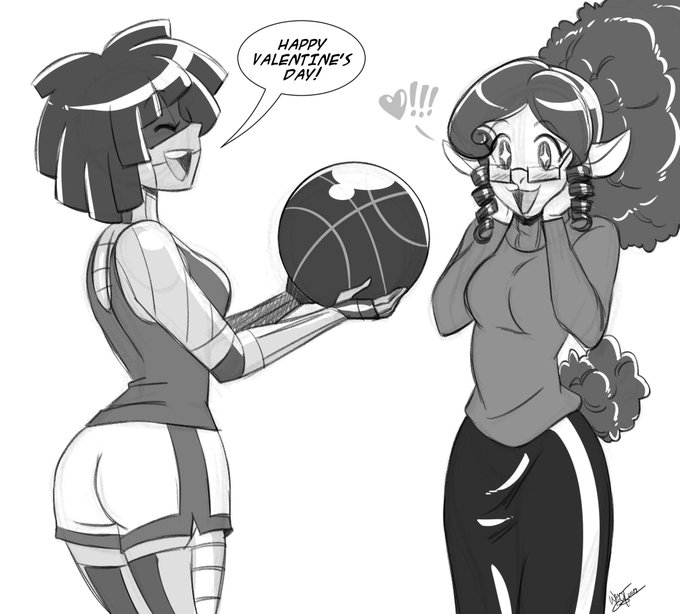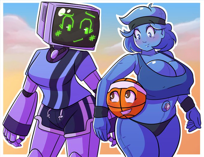 Got a Commission from @2B_Labs of his two OCs Belle the balloon and Grace the AI getting tips to play basketball from my OC Connie as the basketball.