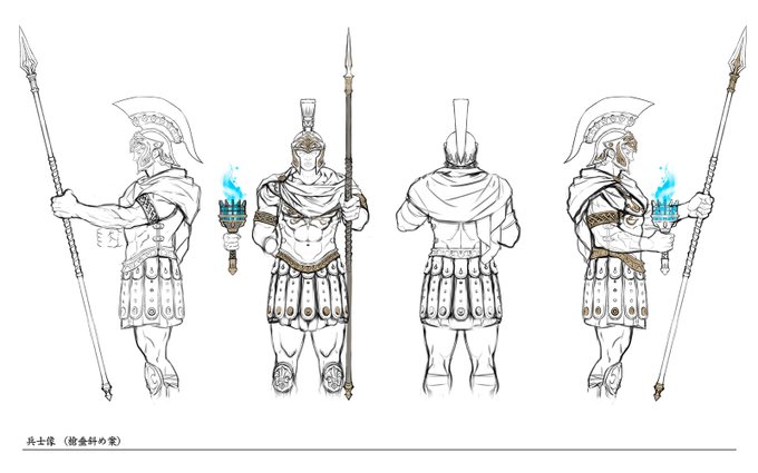 (2/2)エウリュディケ神殿ステージにある女神像と兵士像ですが、神殿のビジュアル的にも特に重要な彫像ということで、ヒロアキさん @SUPER_HIROAKI にデザインしていただきました。装飾など洗練されておりとても素晴らしいです。(アートディレクターより)