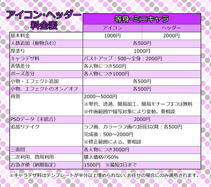 @suitoai ヘッダー基本料金2000円〜になります。専属ということでイラスト用の料金表も置いてきます。