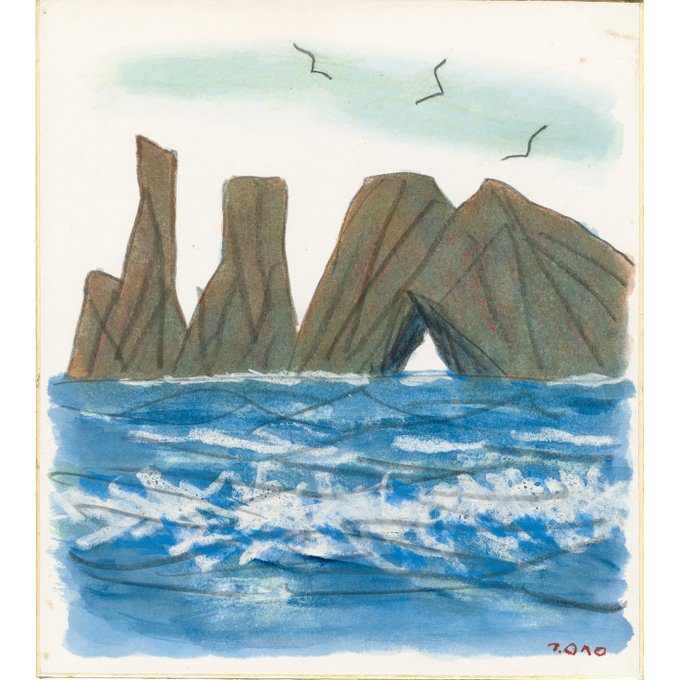 勝浦の海を力強い筆致で描いた1枚。色紙にパステルと水彩で描かれており、迷いのない線はたっぷりとした波の重みとリズムを見事にとらえています。(1/2)