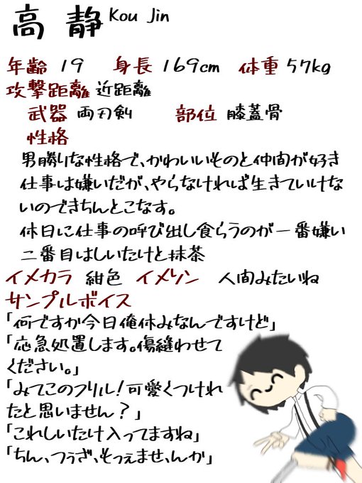 #メメモリ_CS 膝から剣出てくる高静(コウ ジン)くんちゃんです!!!!!! 一枚め大まかな説明、2枚目イラスト