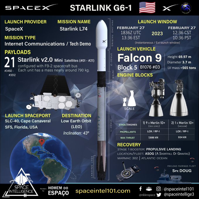 @SpaceX to launch the 1st batch of 22 v2.0 #Starlink mini🛰️ (downscaled version of regular Gen2) on its #Falcon9 #B1076.3 from @SLDelta45 SLC-40, Cape Canaveral.