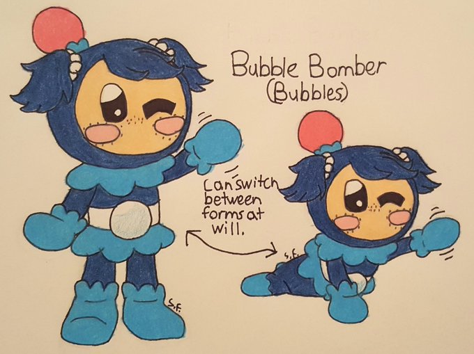 Bubble Bomber, also known as Bubbles, is a Bomberman based on the Popplio line. He's a very friendly and happy lad that likes showing off some new tricks he learned to his friends. He often gets mistaken for a girl, but he doesn't mind. He doesn't change very much as he grows up.