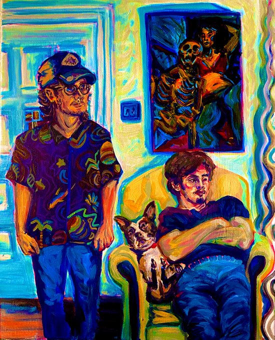 Here’s my newest commission, featuring two brothers who’s mom owns another one of my paintings, featured in the background.☺️💚