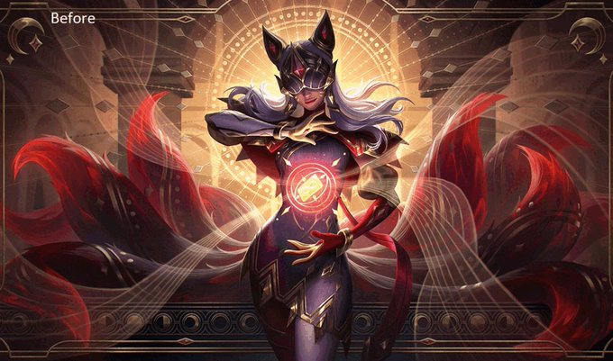 Here's the before and after of the Arcana Ahri splash tweak, relatively minor changes but her tails were adjusted