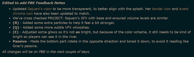 PROJECT: Sejuani's Feedback thread was updated, most notably her helmet was changed to be more transparent in game