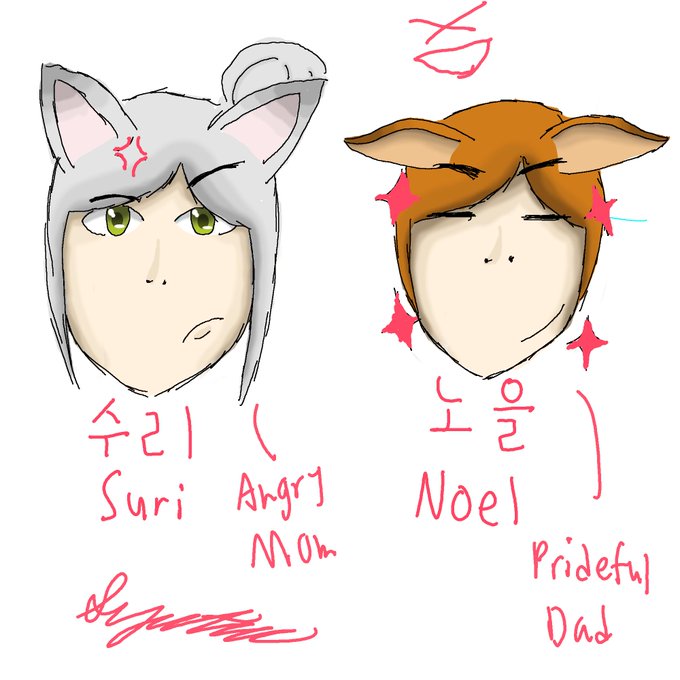 Humanization version of the SuriNoel family. Sorry about my bad Korean handwriting, I don't know how to write ion Korean. Hope you like it. #SuriNoel #Iz #Soul #Noel #Raon #Suri #SouthKorea #KoreanCatFamily