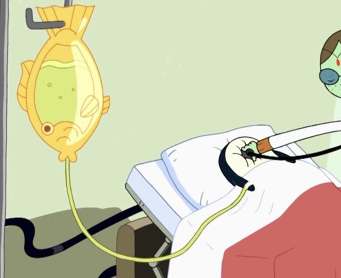I love noticing weird background details in Adventure Time. Like how this fluid bag (is that what they’re called???) in Chamber of Frozen Blades is also a fish. It’s just funny