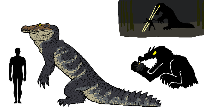 a cryptid generated by the comic challenge, its first appearance was on the side of a road in Nigeria licking the avenue, it has the appearance of a huge bipedal crocodile, it is said that it has glowing eyes and can shoot lasers through them at night. https://t.co/9Fp5iW8cXf