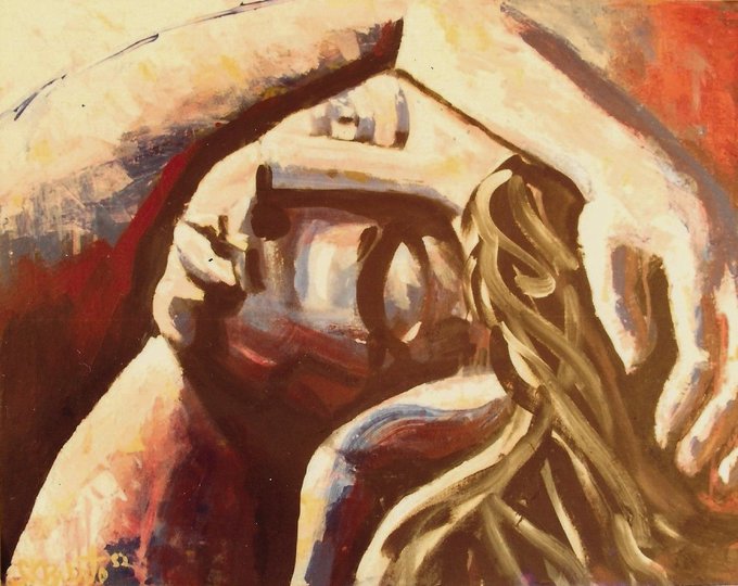 This Work of Art, "In the Arms of an Angel"(Acrylic and Pen and ink. 8"x12") was conceived, executed a few days prior to my heart failure and almost failed my open-heart surgery and a replacement, mitral heart valve. June 28, 2008. A work, created on a prophetical level.